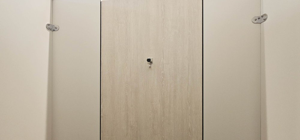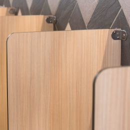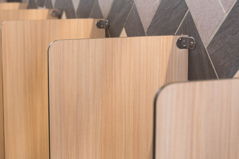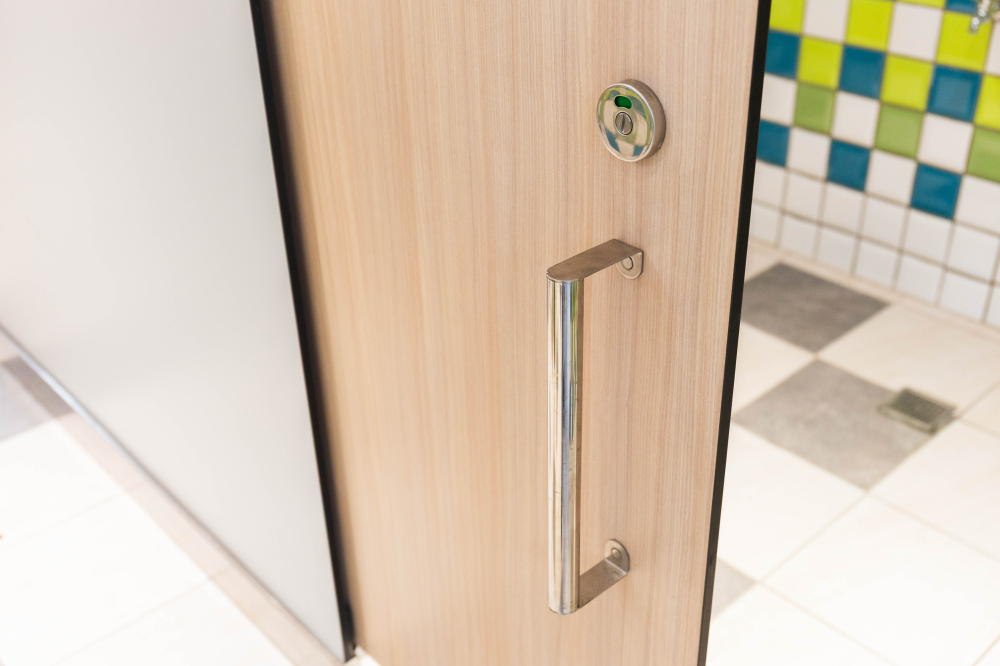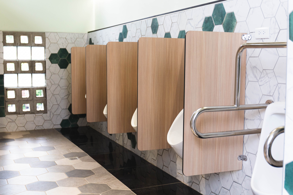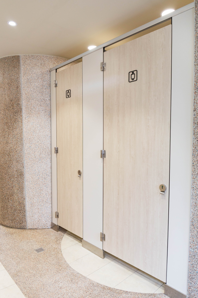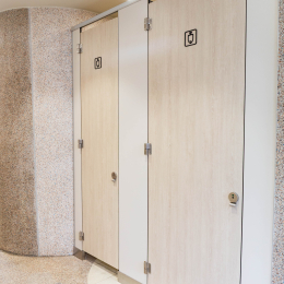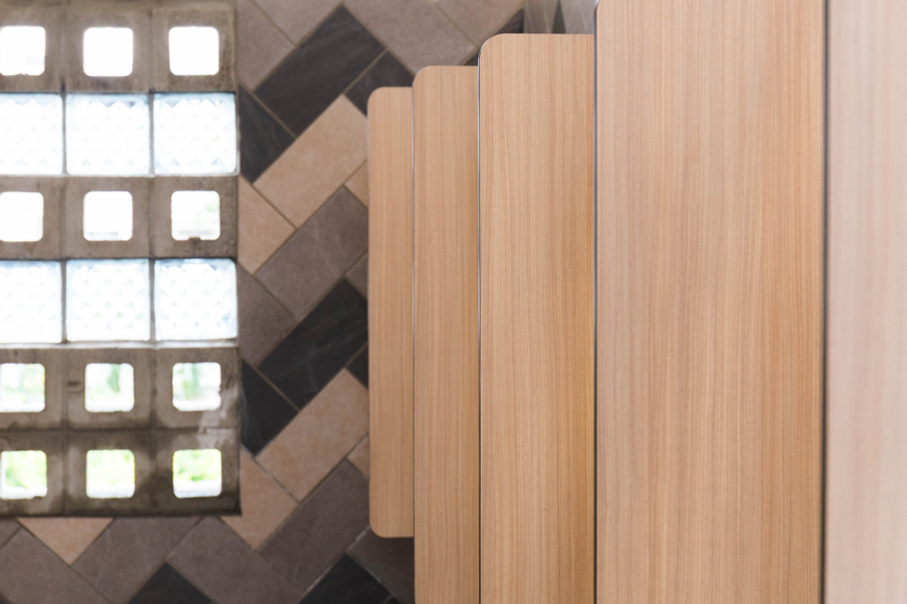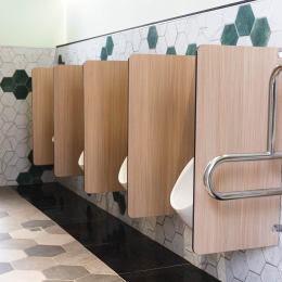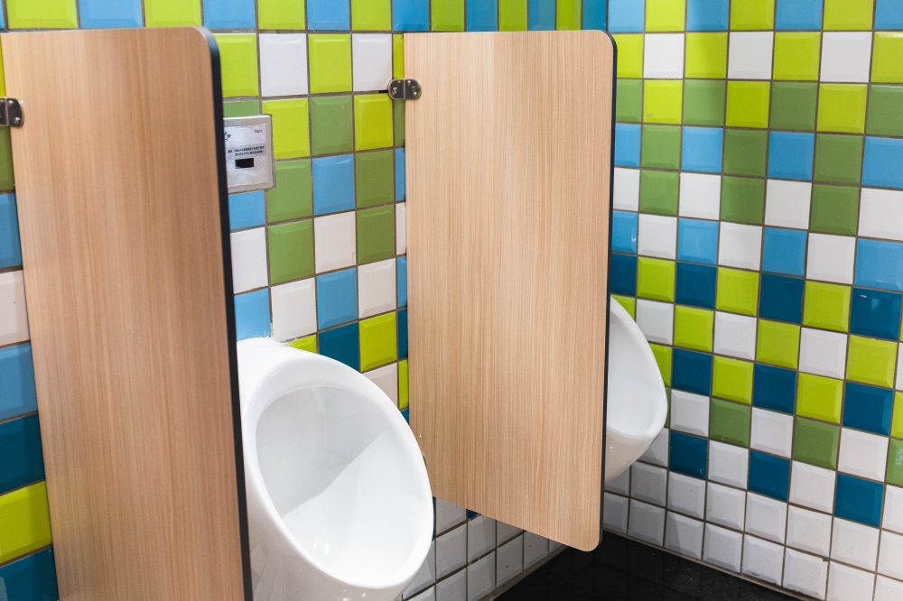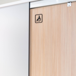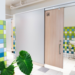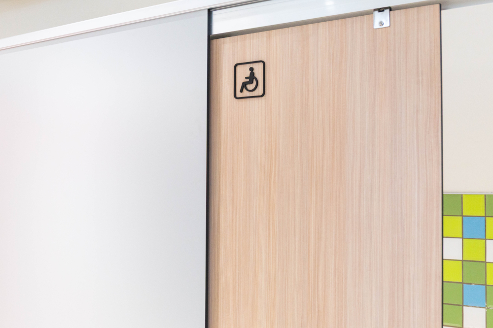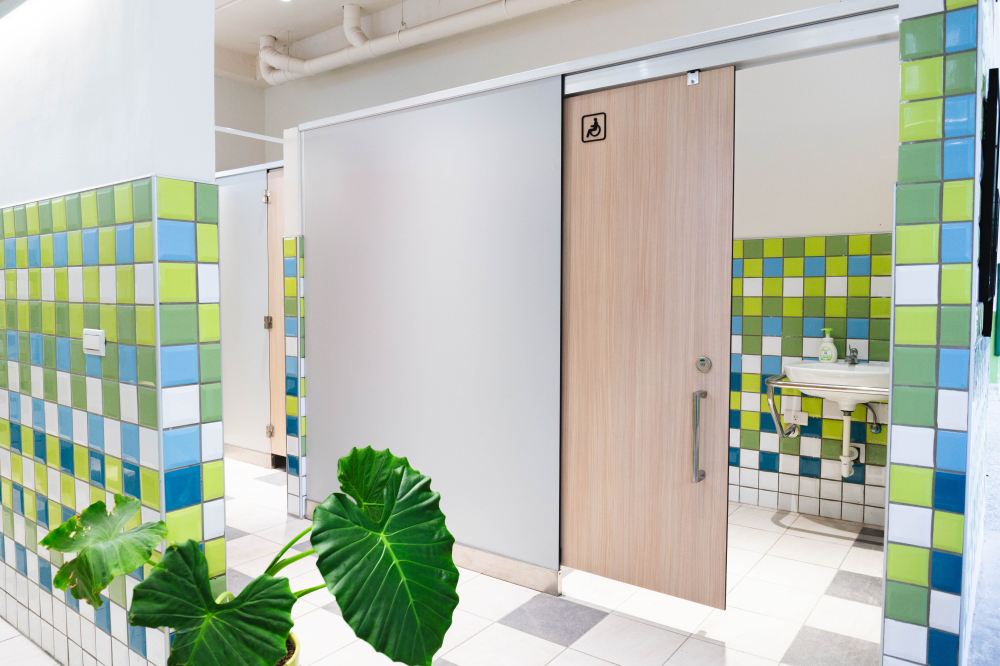 小學裡設置了兼具實用性與現代感的無障礙廁所,亮麗繽紛的色彩富有童真趣味,營造出活潑清新的氛圍,木紋色的搗擺增添一種溫暖、自然質感,這樣的廁所給人明亮整潔且安全舒適的感受。